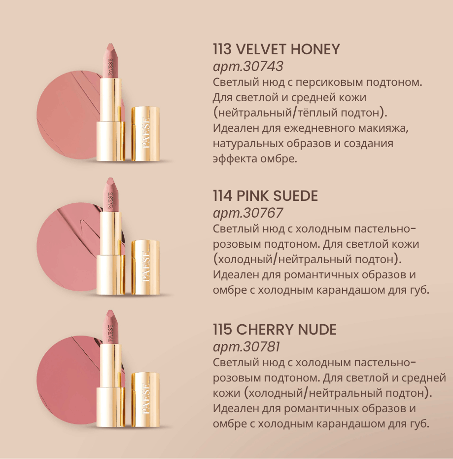 Помады доступны в трех универсальных нюдовых оттенках, которые подходят для любого типа красоты. Формула обогащена активными ингредиентами-керамидами, пептидами и маслом жожоба — и комплексом LINEFILL, который делает губы более полными.